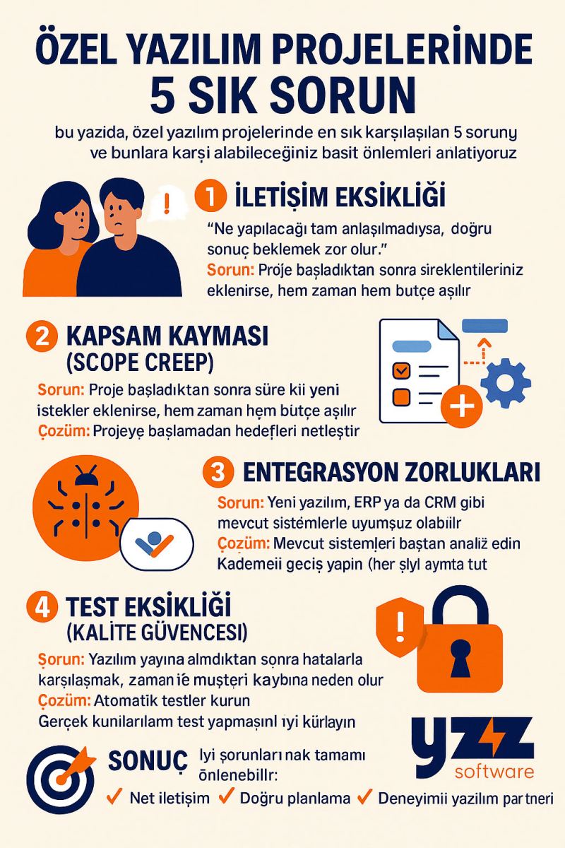 Bu yazıda, özel yazılım projelerinde en sık karşılaşılan 5 sorunu ve bunlara karşı alabileceğiniz basit önlemleri anlatıyoruz.
